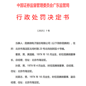 4月9日,广东证监局2025年“1号罚单”发布,拟IPO企业昆腾微电子股份有限公司(以下简称昆腾微)因涉欺诈发行,公司及相关责任人被监管重罚。