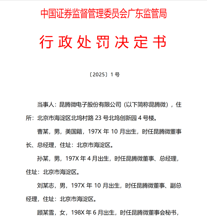 对昆腾微电子股份有限公司责令改正,给予警告,并处以400万元罚款。对时任董事长、总经理,曹某给予警告,并处以200万元罚款,对时任高管孙某、刘某志、顾某雪给予警告,并分别处以120万元罚款。