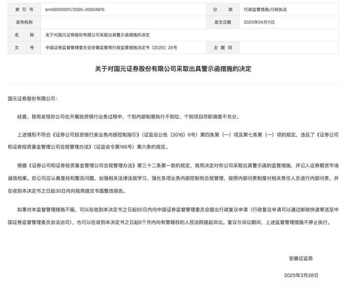 4月11日,安徽证监局公告,经查,发现国元证券在开展投资银行业务过程中,存在个别内控制度执行不到位、个别项目尽职调查不充分等情形。