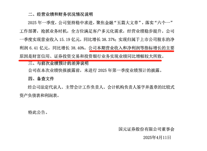 尽管在年内已接连收到 2 份投行罚单,但投行业务作为国元证券的核心业务之一,依然为公司 2025 年一季度的利润增长做出了突出贡献。公司于4月10日发布2025年一季度业绩快报,实现营业收入15.19亿元,同比增长38.37%;归属于上市公司股东的净利润6.41亿元,同比增长38.40%。