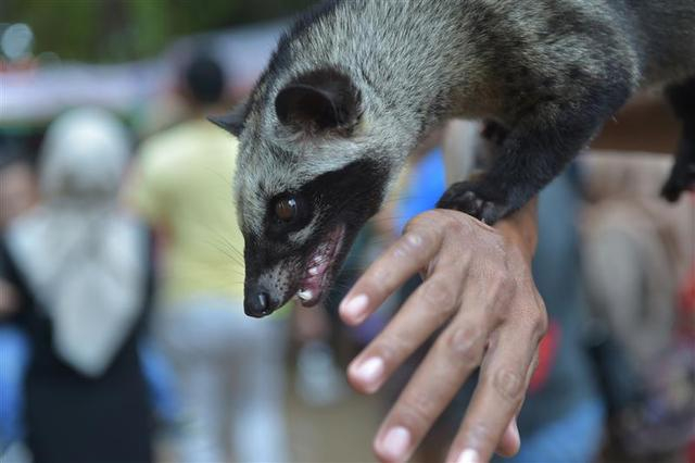 在印尼雅加达的一家棕榈猫俱乐部,一只亚洲棕榈猫趴在主人的手臂上。在印度尼西亚,亚洲棕榈猫被饲养在咖啡种植场,它们吞吃咖啡果实后将不能消化的咖啡豆排出体外,成了世上最名贵的咖啡之一——猫屎咖啡。 新华社