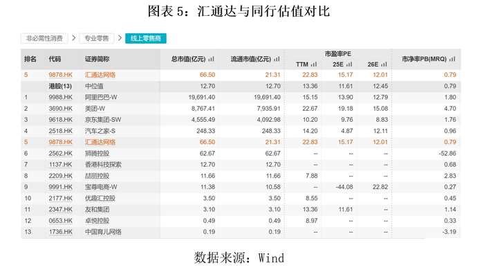 Wind数据显示,截至4月11日收盘,汇通达总市值为66.5亿港元,在港股13家线上零售商上市公司中排名第五;市盈率(TTM)为22.83倍,在行业内处于中等水平。