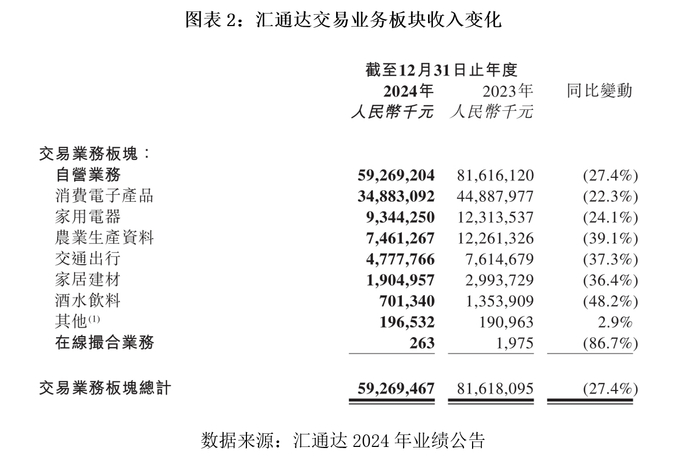 2024年,汇通达的交易业务板块收入全线下滑(除其他),且下滑幅度基本都在20%以上,其中农业生产资料、交通出行、家居建材收入下滑幅度较大。对于交易业务收入的下滑,汇通达将原因归结于“市场环境严峻”以及“主动削减低效业务”。