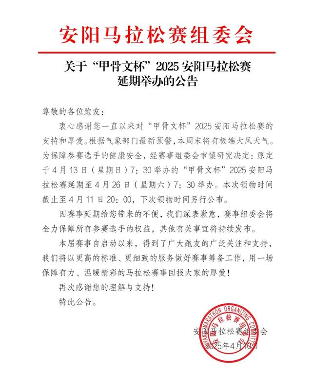 4月10日,“行走是吾乡”2025年河南省自行车公开赛(济源站)暨济源黄河公路自行车赛组委会发布公告,根据最新气象资料分析,受较强冷空气影响,济源全域将有阵风8-9级,考虑到参赛选手人身安全,原定于4月12日-13日举办的“行走是吾乡”2025年河南省自行车公开赛(济源站)暨济源黄河公路自行车赛延期至4月13日-14日举行。