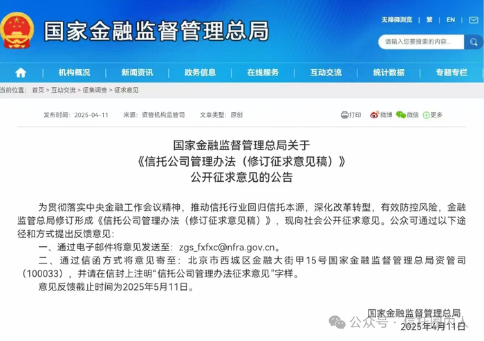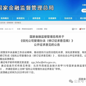 4月11日,国家金融监督管理总局就《信托公司管理办法(修订征求意见稿)》公开征求意见。