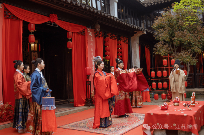 绿树掩映下,新人身着大红色明制婚服,凤冠霞帔,向在场的亲朋好友行礼。一场明制婚礼在苏州市姑苏区耦园婚姻登记服务中心举行。漫步在耦园内,处处皆景:载酒堂、听橹楼、魁星阁、吾爱亭……一幢幢亭台楼阁与黄石假山、秀美池塘、百龄乔木交相呼应,一对对新人或着婚纱或着秀禾,也融入景中,为耦园增添爱情色彩。