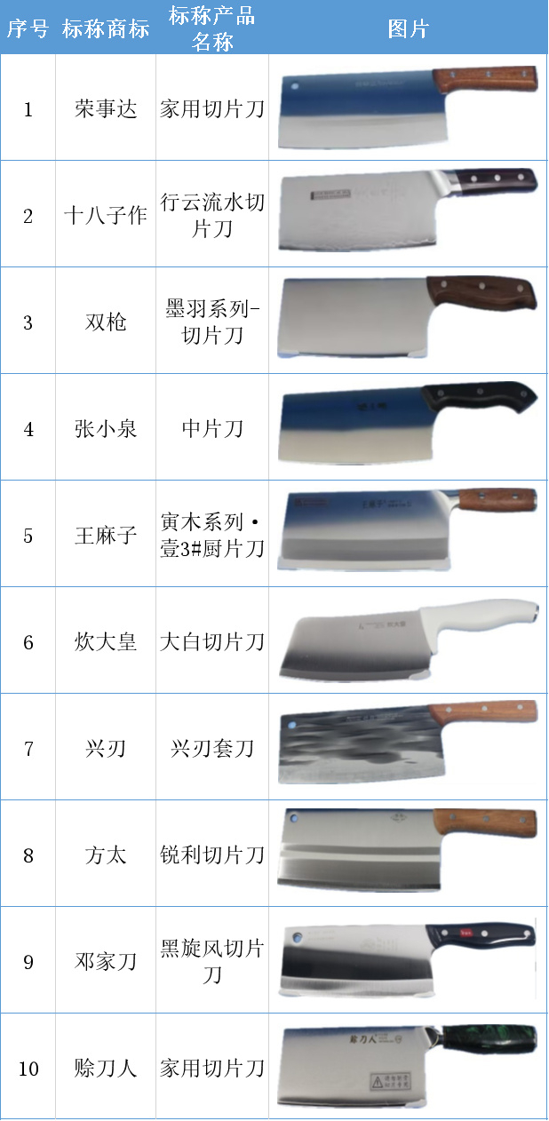 比较试验结果显示,切片刀中十八子作、邓家刀、王麻子、荣事达等品牌样品的耐用度表现较优;斩切刀中芭酷丽、苏泊尔、楚家刀、ASD爱仕达等品牌样品的耐用度表现较优。