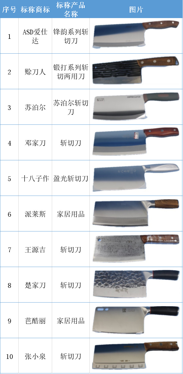 杭州消保委共选取了20款厨用刀具,其中切片刀和斩切刀各10款,均为不锈钢材质。