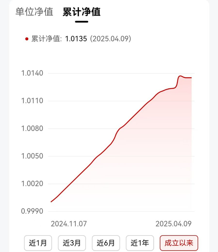 产品说明书显示,该产品投资债权类资产的比例为100%,主要挖掘固收市场投资机会。该产品成立于2024年11月7日,正好赶上去年底债市火热行情。2月中旬-3月中旬债市下跌期间该产品净值竟然能继续稳步攀升,4月7日债市大涨该产品净值也出现小幅拉升。不过今天最新披露的净值数据显示该产品近两日随着债市震荡净值也出现小幅下跌。