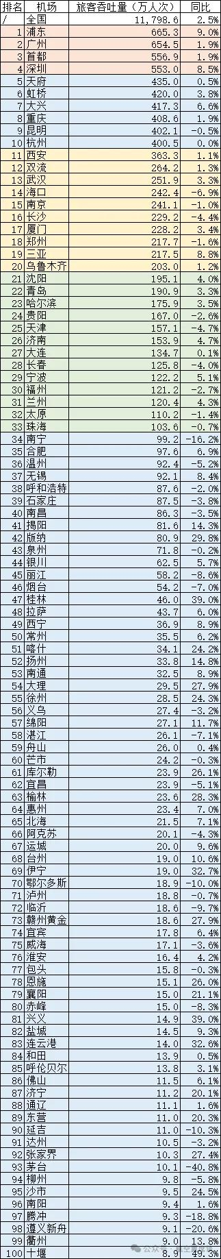 2025年3月:我国100个机场排行榜!