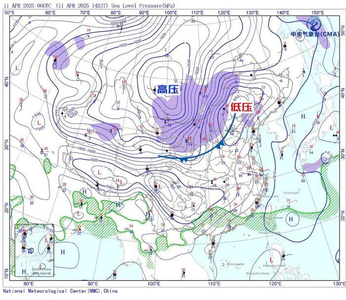 周五到周日,我国华北地区会出现历史同期罕见持续性大风,局地阵风可达11至13级。这主要是在冷空气到来前,华北地区形成了一个低压气旋。冷空气高压和低压之间存在巨大的气压落差,空气从高压往低压方向跑形成风,就像水往低处流,落差越大风越大。怎么看落差呢?可以看标注的高低压值,最直观的是看图中黑色的等压线,线越密集落差越大。
