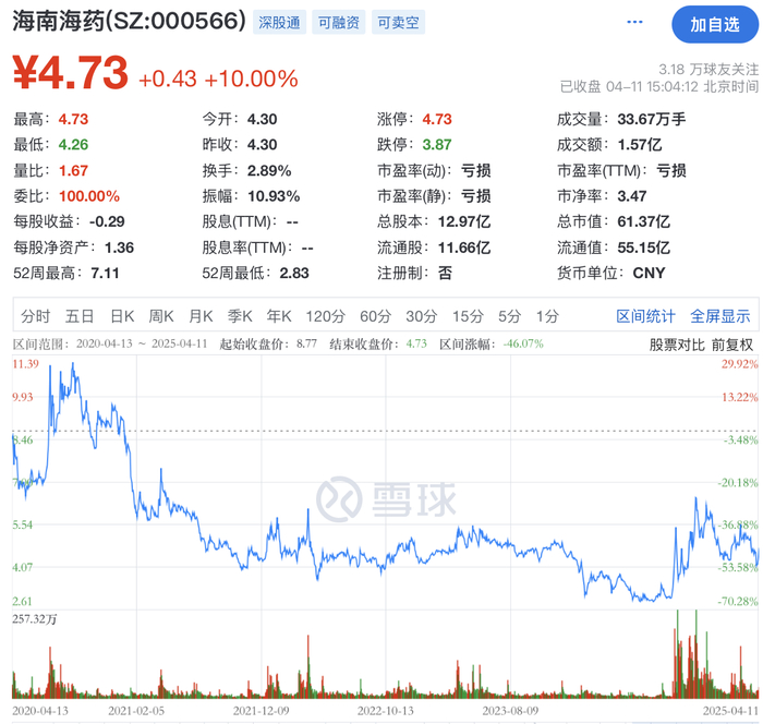 二级市场上,海南海药4月11日涨停报4.73元/股,总市值61.37亿元。该股近5年已跌去46%。