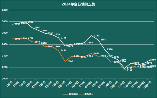 2022年茅台的市场价格就开始一路下行,市场价格从3300元下滑至2024年底的2200元,整整下跌了超1000元。之前的囤货神器原箱茅台也失去了魔力,从高点到目前其价格也跌超1000多。原箱茅台在之前比散瓶茅台的价格要高出好几百元,如今两者价格仅相差几十元。