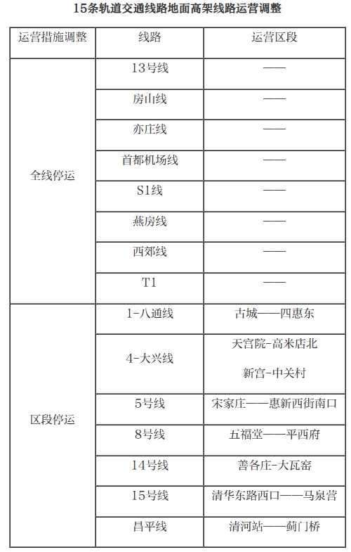 涉及首都机场线、八通线等!明日首班车起,北京15条地面高架地铁线路区段停运