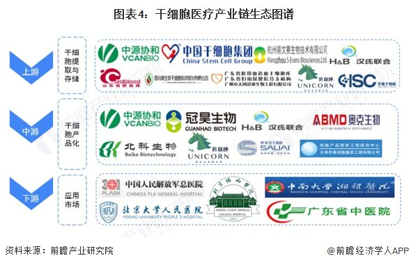 从产业链生态图谱来看,上游是干细胞医疗行业最基础、最前端的业务,也是资本聚集最多的地方。上游市场的代表企业有:中国脐带血库企业集团、中源协和细胞工程股份有限公司、山东省齐鲁干细胞工程有限公司和四川新生命干细胞科技股份有限公司等。