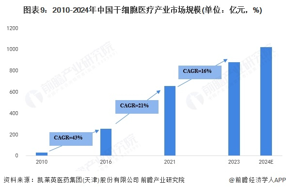 我国的干细胞产业与全球较为接近,同样包括干细胞治疗服务业务、干细胞存储业务和干细胞制药业务。根据凯莱英医药集团(天津)股份有限公司整理数据,我国干细胞产业市场规模呈逐年增长趋势,2010年相关市场规模仅为30亿元,2023年市场规模已达880.4亿元,近两年年均复合增长率达16%。初步统计2024年中国干细胞医疗市场规模突破1000亿元。
