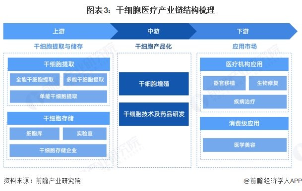 在干细胞产业链中,处于上游的主要是干细胞采集与存储企业。细胞储存通过一定的方法将细胞中的APSC多能细胞保存一定的期限,保证细胞的功能和活性不受明显的影响。干细胞产业链中游是干细胞增殖与药物研发企业,主要从事技术研发工作。下游由开展干细胞医疗的机构组成,以体系三甲医院为主,目前,干细胞治疗可用于对组织细胞损伤修复、代替损伤细胞功能等领域的疾病治疗;用体外培养、扩增的干细胞培育人体组织器官进行器官移植以及对自身免疫性疾病进行生物修复。此外,在消费级应用领域,干细胞还能用于医学美容,延缓细胞衰老。