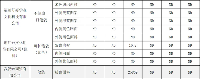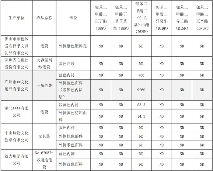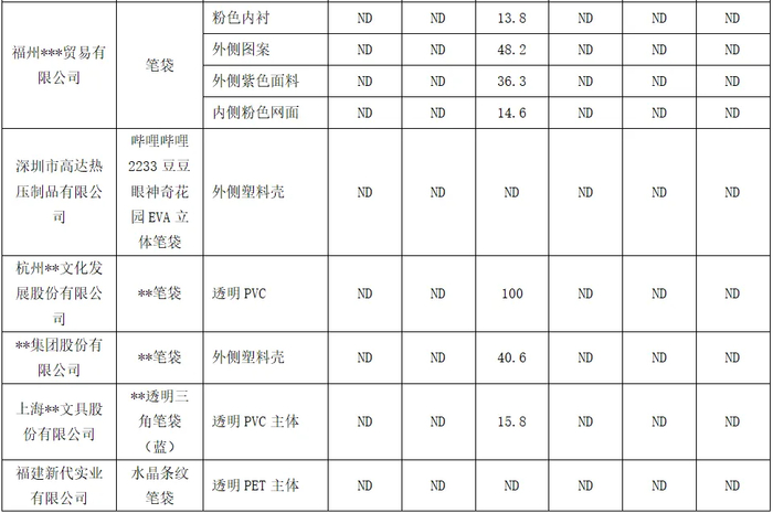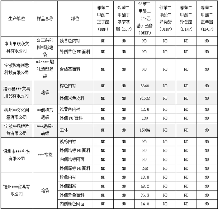DEHP、DBP、BBP三种增塑剂为GB 21027-2020《学生用品的安全通用要求》标准中规定的项目(可触及的塑料件中邻苯二甲酸酯增塑剂的限量),DNOP、DINP、DIDP为相关产品标准要求外项目。除塑料材质外,目前国家相关标准对纺织、人造皮革等材质笔袋产品中的增塑剂未作相关规定。因此,本次比较试验仅提供实测数据,除以塑料材质为主体材质的笔袋出具带CMA章的报告外,其余材质的笔袋出具不带CMA、CNAS章的报告。因此,也对检出增塑剂但符合国家标准的塑料材质产品和检出增塑剂的人造皮革(含PU皮革)、纺织面料产品的生产单位作脱敏处理。