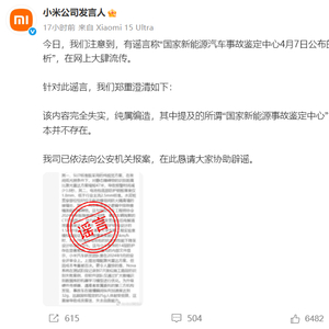 4月11日,小米公司发言人发文称,我们注意到,有谣言称“国家新能源汽车事故鉴定中心4月7日公布的初步分析”,在网上大肆流传。