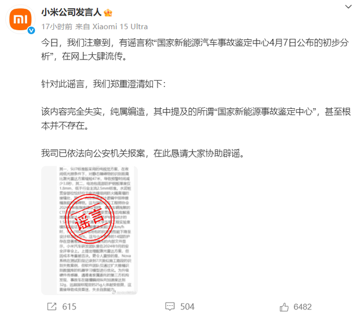 小米称 “国家新能源汽车事故鉴定中心公布分析” 为谣言,已报案