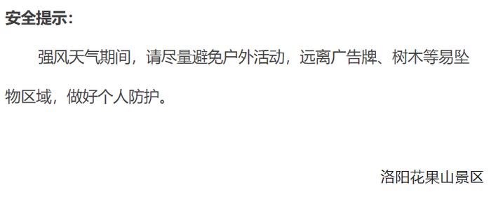 提醒参观龙门石窟的游客,请您及时关注天气变化,做好防风措施,如遇突发情况,请听从景区工作人员安排有序撤离至安全区域。