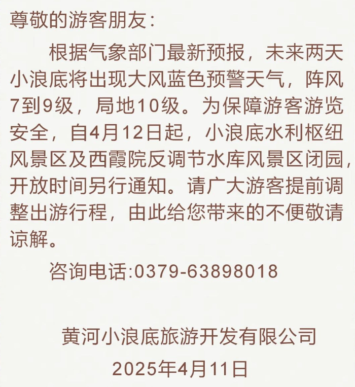 根据气象部门最新预报,未来两天新安县将出现大风黄色预警天气,局部最高风力可达10级。为保障游客的游览安全,青要山景区将按照极端天气应急预案进行部署,自2025年4月12日起,实施紧急闭园,恢复开放时间另行公告。