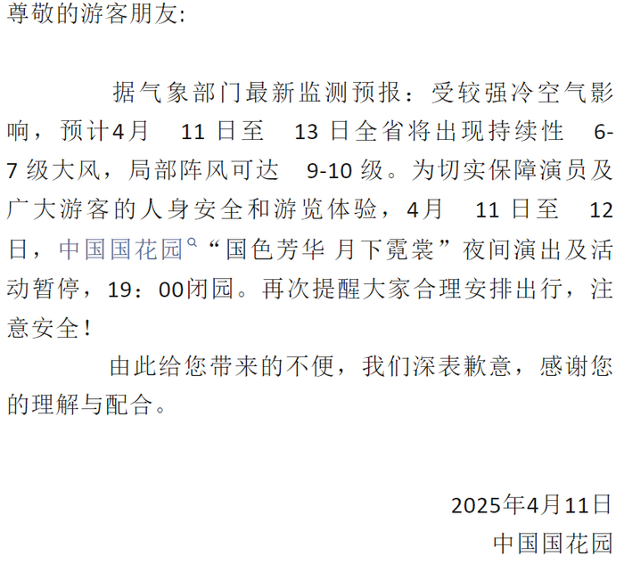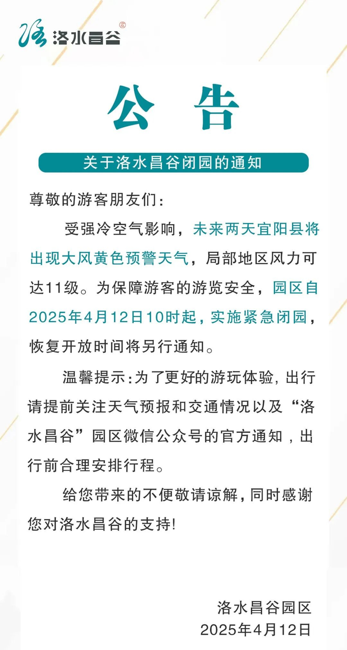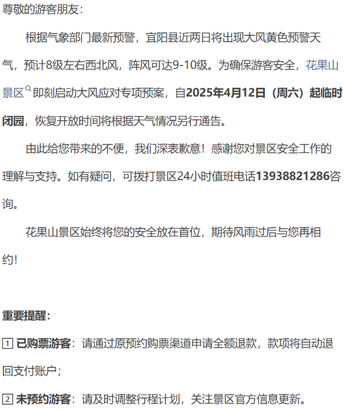 根据气象部门最新预报,未来两天栾川县将出现大风黄色预警天气,局部最高风力可达12级。为保障游客的游览安全,老君山景区将按照极端天气应急预案进行部署,自2025年4月11日18时起,实施紧急闭园,恢复开放时间另行公告。目前已进入景区的游客,请您及时关注天气变化,做好防风保暖措施,如遇突发情况,请听从景区工作人员安排有序撤离至安全区域;已成功预约未核销的游客,请通过原购票渠道申请全额退款;未预约的游客,请及时调整行程。您可以通过景区官方微信公众号、官网等渠道关注最新动态。由此给您带来的不便我们深表歉意,感谢您的理解与配合!