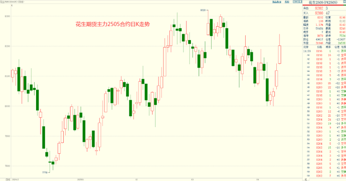 花生期货方面。花生期货主力2505合约近期持续震荡,未有大的方向,至2025年4月11日收盘在8202元/吨。