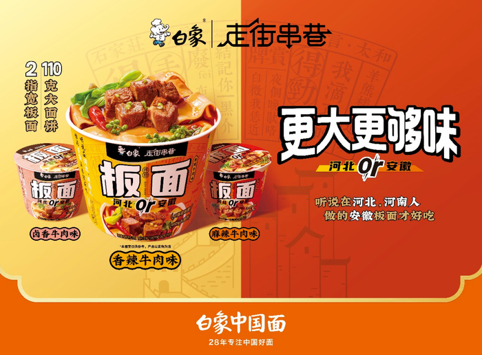在统一之外,白象也盯上了快速增长的板面赛道。今年,白象板面迎来全新升级,并喊出“更大更够味”的口味。