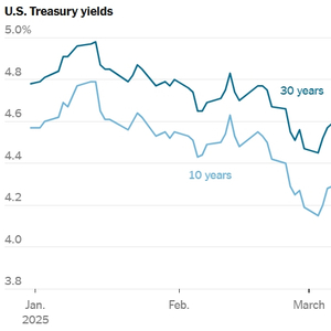 美国10年期和30年期国债收益率变化。《纽约时报》