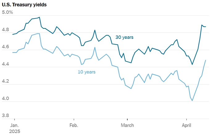 与此同时,美元汇率下滑,美国国债市场抛售潮加剧。最能体现美国资产抛售情况的美国10年期国债价格下跌,推动其收益率升至两个月高点,创下自2001年以来的最大单周涨幅,一周飙升0.5%。30年期美债收益率的上升也创下了历史新高。