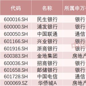 险资前十大重仓股中,有6只银行股,包括民生银行、浦发银行、兴业银行、浙商银行、招商银行、邮储银行,另外4只重仓股分别是中国联通、中国电信、金地集团、华侨城A。