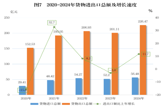 全年货物进出口总额282.95亿元,比上年增长11.7%。其中,进口总额56.48亿元,增长8.1%;出口总额226.47亿元,增长12.6%。进出口差额(出口减进口)169.99亿元,比上年缩小21.08亿元。