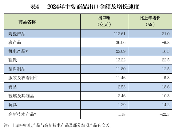 各类主要出口商品中,陶瓷产品出口112.61亿元,比上年增长21.0%;农产品出口36.06亿元,下降9.8%;机电产品出口23.09亿元,增长16.5%;服装及衣着附件出口11.46亿元,下降6.3%;鞋靴出口13.22亿元,增长22.5%。