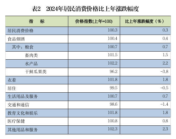 全年居民消费价格水平比上年上涨0.3%。分类别看,八大类商品及服务价格“六涨二降”。其中,其他用品及服务价格涨幅居前,上涨2.3%,教育文化及娱乐类价格上涨1.8%,衣着类上涨1.8%,食品烟酒价格上涨0.4%,生活用品及服务上涨0.7%,医疗保健类上涨0.8%,居住类下降0.5%,交通和通信类下降1.4%。