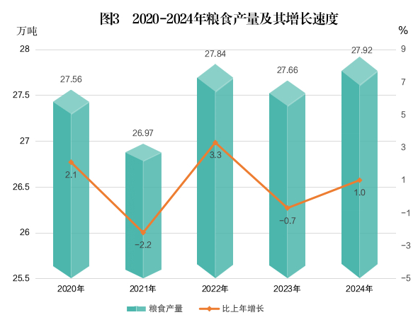 全年粮食总产量27.92万吨,比上年增长1.0%;水果总产量29.15万吨,增长0.8 %;茶叶总产量3.62万吨,增长11.1%;蔬菜总产量58.28万吨,增长1.4%。