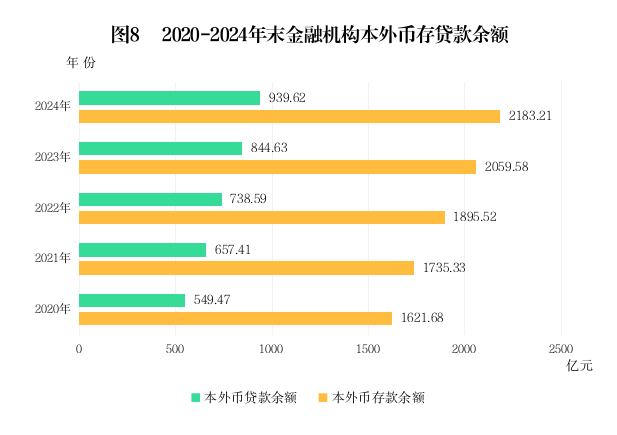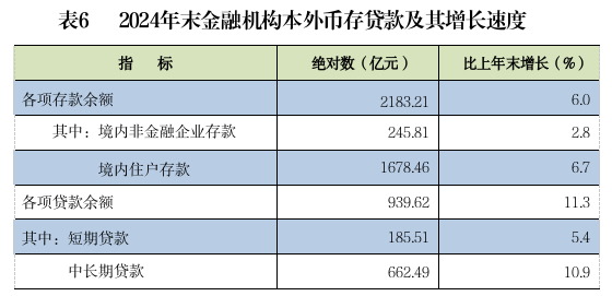 2024年末,全市金融机构本外币存款余额2183.21亿元,比上年末增长6.0%;其中住户存款余额1678.46亿元,增长6.7%。金融机构本外币贷款余额939.62亿元,增长11.3%;其中,中长期贷款662.49亿元,增长10.9%。存贷比为43.0%,比上年提高2个百分点。