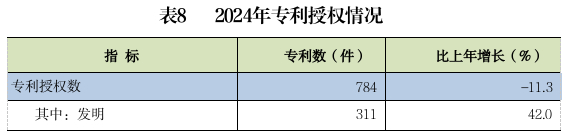 全年专利授权量7846件,下降11.3%。其中,发明311件,增长42.0%。全年立项科技项目共29项,其中省级4项,市级25项。全年新认定国家级高新技术企业130家。