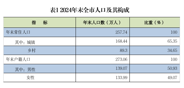 2024年末,全市常住人口257.74万人,比上年末增加0.12万人;其中,城镇常住人口168.44万人,占常住人口比重(常住人口城镇化率)65.35%。全市户籍总人口273.06万人;全年出生人口2.46万人;死亡人数1.84万人。