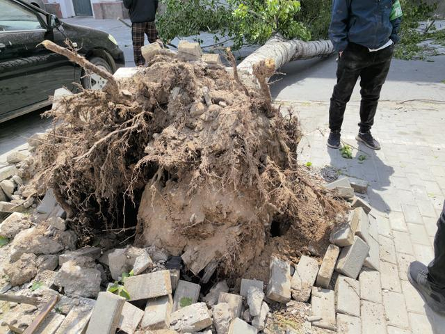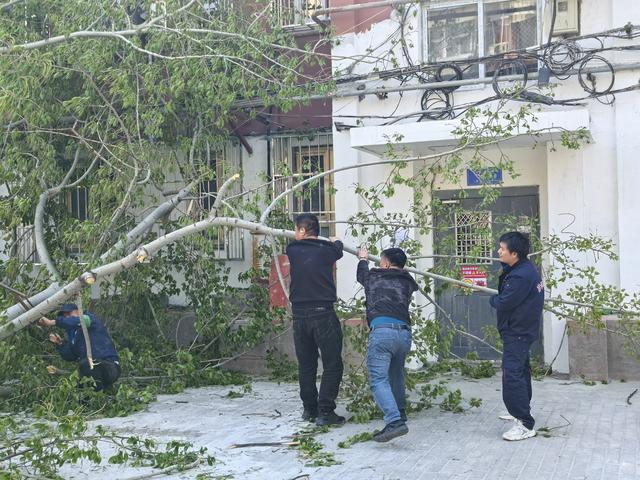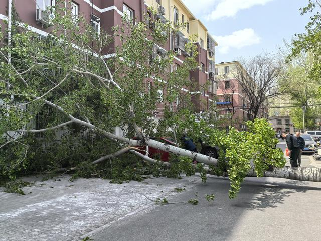 4月12日,北京遭遇大风天气,石景山区古城街道水泥厂社区内一棵大树被大风刮倒,砸中两辆停放在旁的私家车。