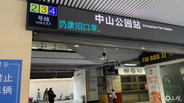 记者看到,地铁中山公园站1号口外,有一个无障碍电梯指示牌,上面写明乘坐2号线要去11号口,去3/4号线则没有说明在哪个出入口附近,仅配了一个向前走的箭头标识。至于11号口的方位,指示牌未说明,更没有配箭头,要靠自己看地图寻找。