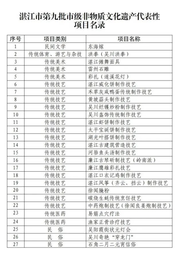《湛江市人民政府关于公布湛江市第九批市级非物质文化遗产名录的通知》