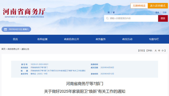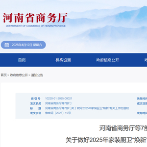 4月12日,《河南省商务厅等7部门关于做好2025年家装厨卫“焕新”有关工作的通知》(以下简称《通知》)发布。