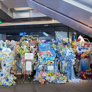走进上海金融街购物中心,就连不太关注二次元文化的市民,都很难不被眼前这一幕所吸引。只见电梯口及走廊上,放满了密密麻麻的“祝花”,精心装饰的花丛中,摆放着一个个不同的二次元形象,玩家们在一旁附言,祝这些虚拟角色“演出顺利”——如同一场真正的歌手演唱会一样。