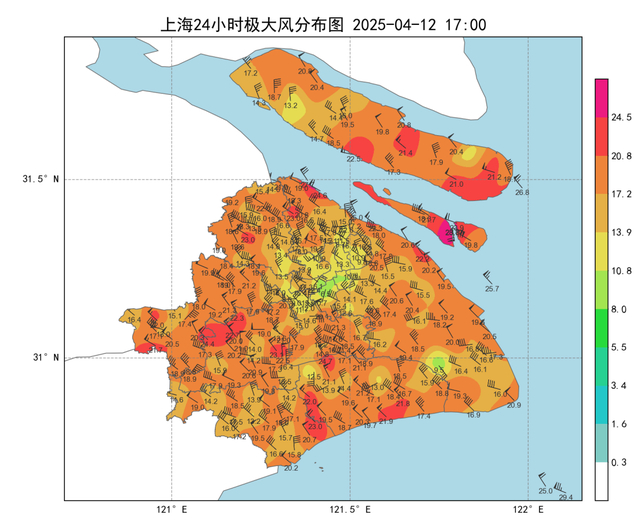 从昨天开始,我国多地出现8到10级大风,局地阵风14级以上。今天(12日)下午,上海也发布了大风黄色预警。过去24小时风力统计显示,上海全城陆地有近半数的地区出现8级阵风,局部出现10级阵风,其中宝山罗泾镇10级为最大。