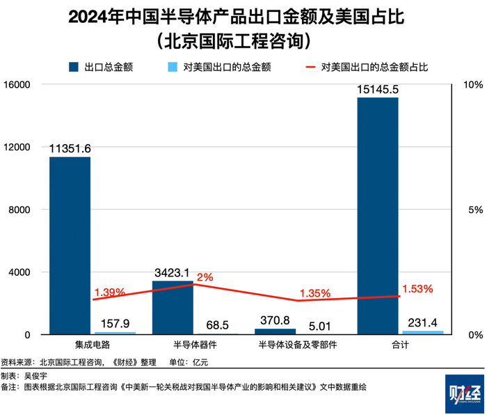 中国海关数据显示,2024年中国半导体产品(含集成电路、半导体器件、半导体设备及零部件)进口金额32738.7亿元,出口金额15145.5亿元。其中从美国直接进口1230.4亿元,占比3.76%。对美国直接出口231.4亿元,占比1.53%。