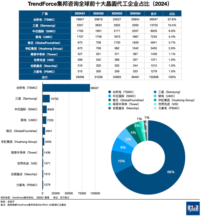 这不算太大的市场份额主要由两家公司贡献。一是晶圆代工厂格罗方德(Global Foundries)。格罗方德总部位于美国加州硅谷,在纽约和佛蒙特州设有制造工厂。根据TrendForce集邦咨询数据,格罗方德属于全球排名前十的晶圆代工厂,但由于全球代工市场高度集中,2024年格罗方德市占率只有约3.7%。