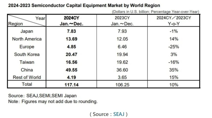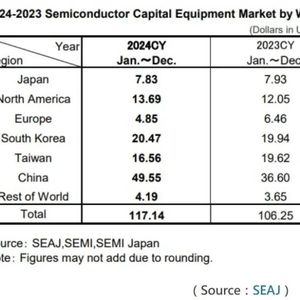 电子发烧友网报道 (文/章鹰)4月10日,日本半导体制造装备协会(SEAJ)公布统计数据指出,2024年全球芯片设备(新品)销售额年增10%达到1,171.4亿美元,年销售额超越2022年(1,076.4亿美元)、创下历史新高纪录。其中,在区域增长来看,中国大陆、中国台湾、韩国是前三大晶片设备市场,合计市占率达到74%。其中,2024年中国市场销售额暴增35%至495.5亿美元、连续第5年成为全球最大半导体设备市场。