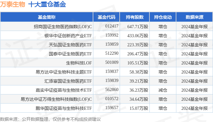 持有万泰生物最多的基金为招商国证生物医药指数(LOF)C,目前规模为19.68亿元,最新净值0.358(4月11日),较上一交易日下跌0.44%,近一年下跌8.21%。该基金现任基金经理为侯昊许荣漫。