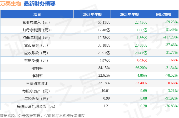据证券之星公开数据整理,近期万泰生物(603392)发布2024年年报。根据财报显示,万泰生物净利润减91.49%。截至本报告期末,公司营业总收入22.45亿元,同比下降59.25%,归母净利润1.06亿元,同比下降91.49%。按单季度数据看,第四季度营业总收入2.97亿元,同比下降45.14%,第四季度归母净利润-1.6亿元,同比上升71.39%。